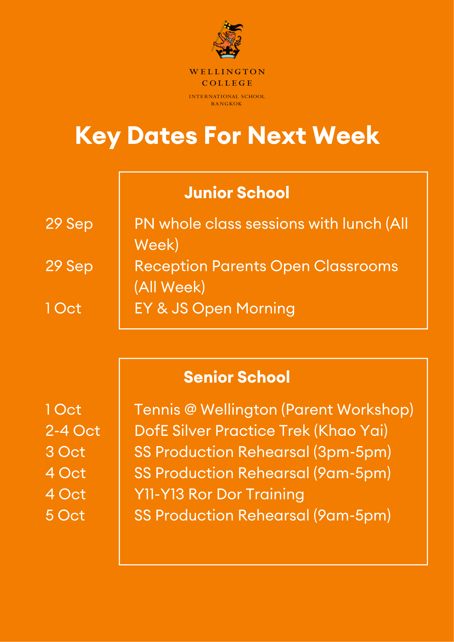 If you have friends, family, or colleagues who are interested in enrolling their children here this year or at any point in the future, please share the poster with them, and don't forget that we offer a referral fee of THB 50,000 for both families. To view the Terms & Conditions for referral and make a submission, you can access the form by clicking the Open Morning image below, or via InWellington: