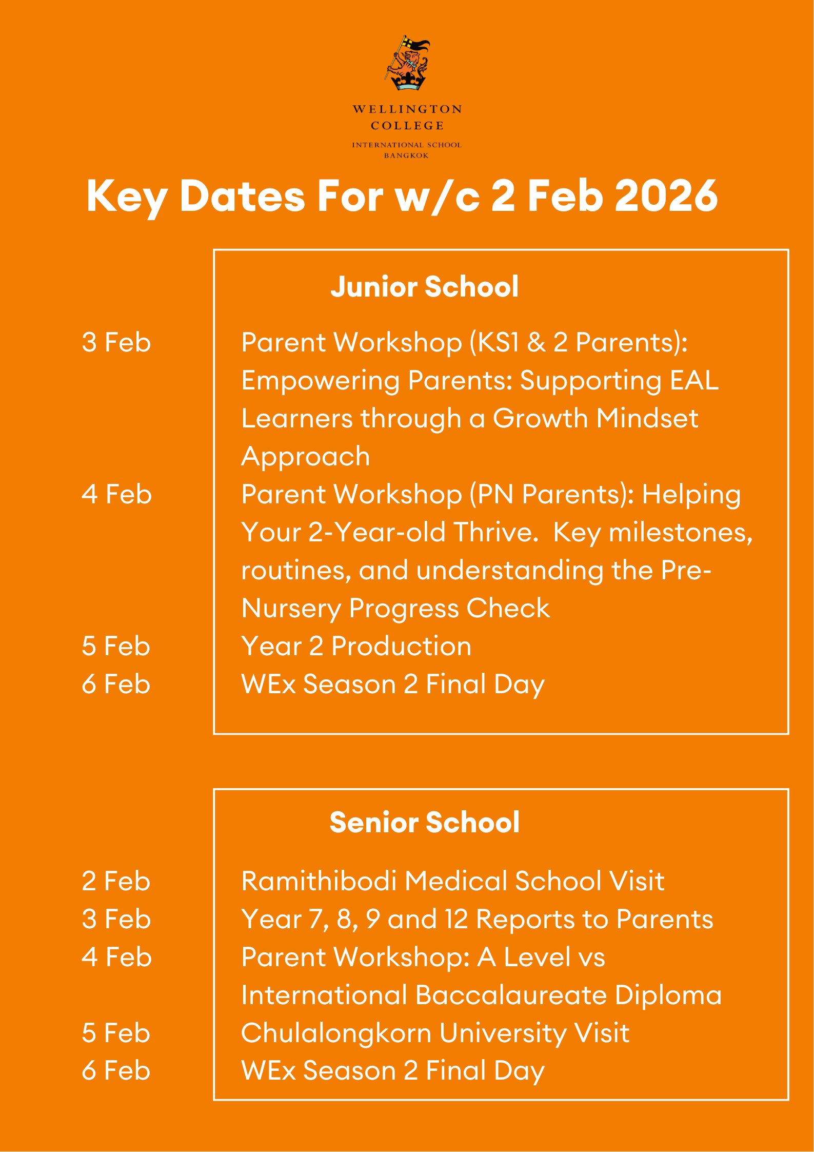 We continue to strengthen the vital partnership between school and home. This week also brings our online Sixth Form Parent Workshops, designed to support families as students navigate the final stages of their school journey, along with our Year 10 Parents’ Evening - an important evening to reflect on the first six months of the IGCSE course and to gather personalised advice on how students can continue to make strong, sustained progress in the months ahead.
